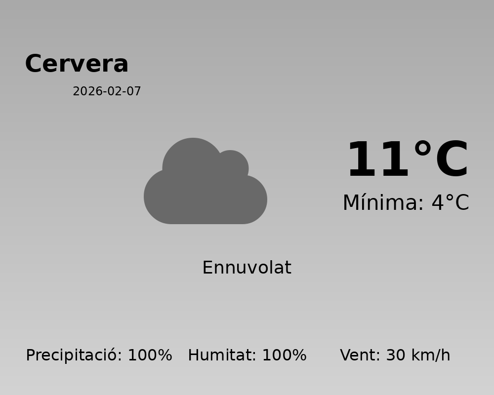 Bon dia, Cervera! Avui el temps es presenta inestable, amb condicions que suggerixen la presència de precipitacions significatives al llarg del dia.