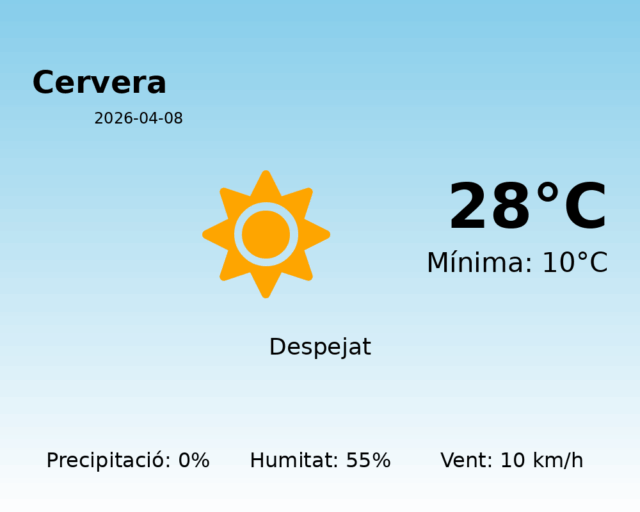 Avui, 8 d’abril de 2026, Cervera gaudirà d’una jornada primaveral amb temperatures agradables. La temperatura màxima arribarà als 28°C, mentre que la mínima es mantindrà al voltant dels 10°C. El dia serà predominantment assolellat, sota un cel clar amb algunes nuvolositat dispersa, classificat en l’escala d’estat del cel com 11.